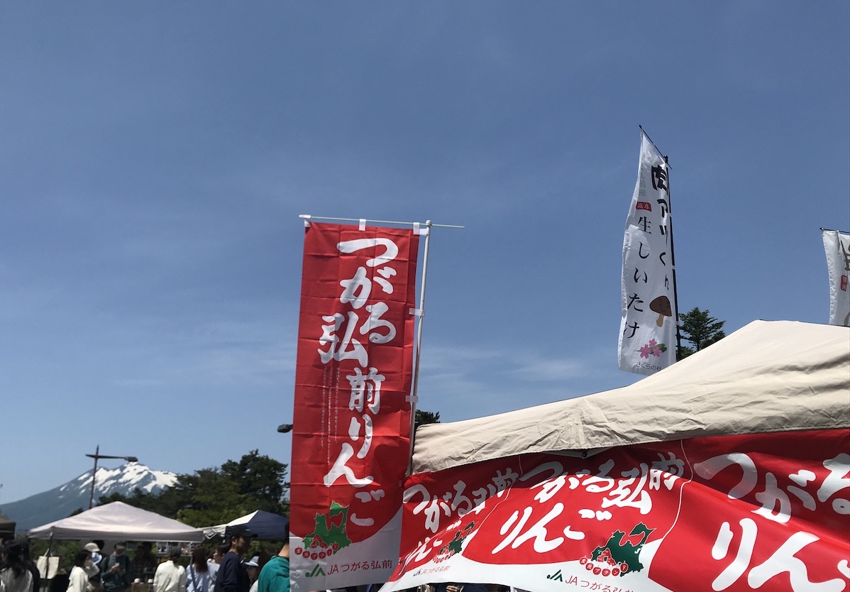 津軽の特産品といえば、りんご! つがる弘前りんごの販売も行われていました。青空の向こうには、津軽富士と呼ばれる岩木山が見えました。