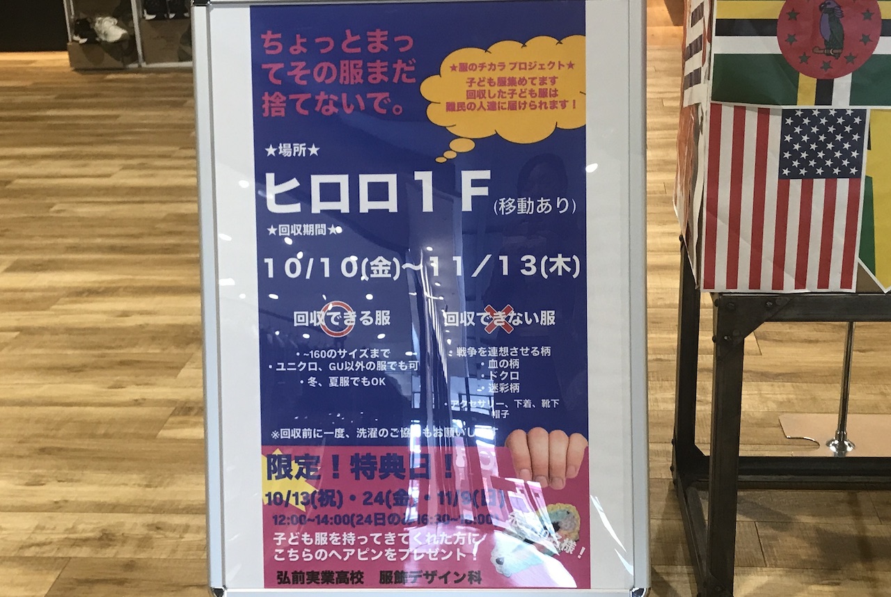 【弘前市】11/13まで、弘前ヒロロに、弘前実業高校「子供服回収BOX」が設置されています。子供服を寄付して「届けよう、服のチカラプロジェクト」に参加しませんか?