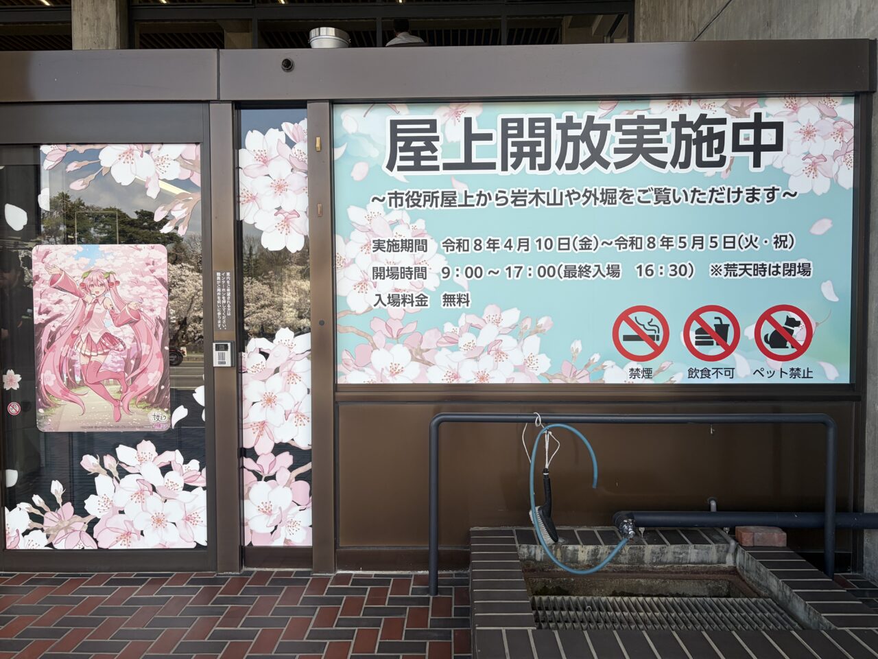 市役所屋上 開放期間は、2026年4月10日(金)~5月5日(火祝)。開放時間は、9:00~17:00 (最終入場は16:30)、入場は無料です。この機会に、弘前市役所 本庁舎「前川本館」屋上から、美しい春の景色を楽しみませんか?