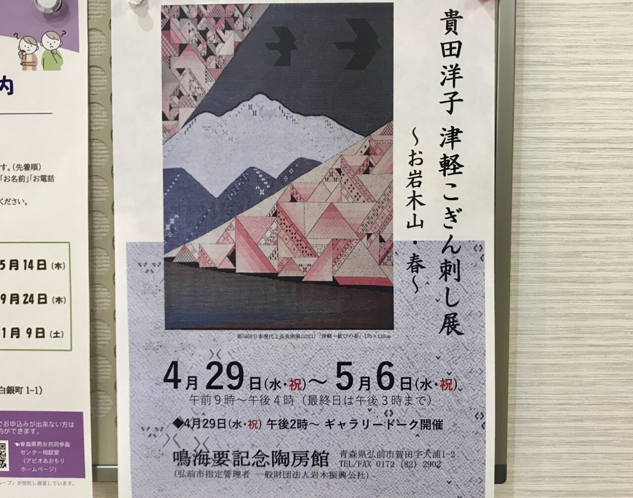 【弘前市】4/29~5/6まで、鳴海要記念陶房館で「貴田洋子 津軽こぎん刺し展~お岩木山・春~」が開催されます。ギャラリートークは4/29!